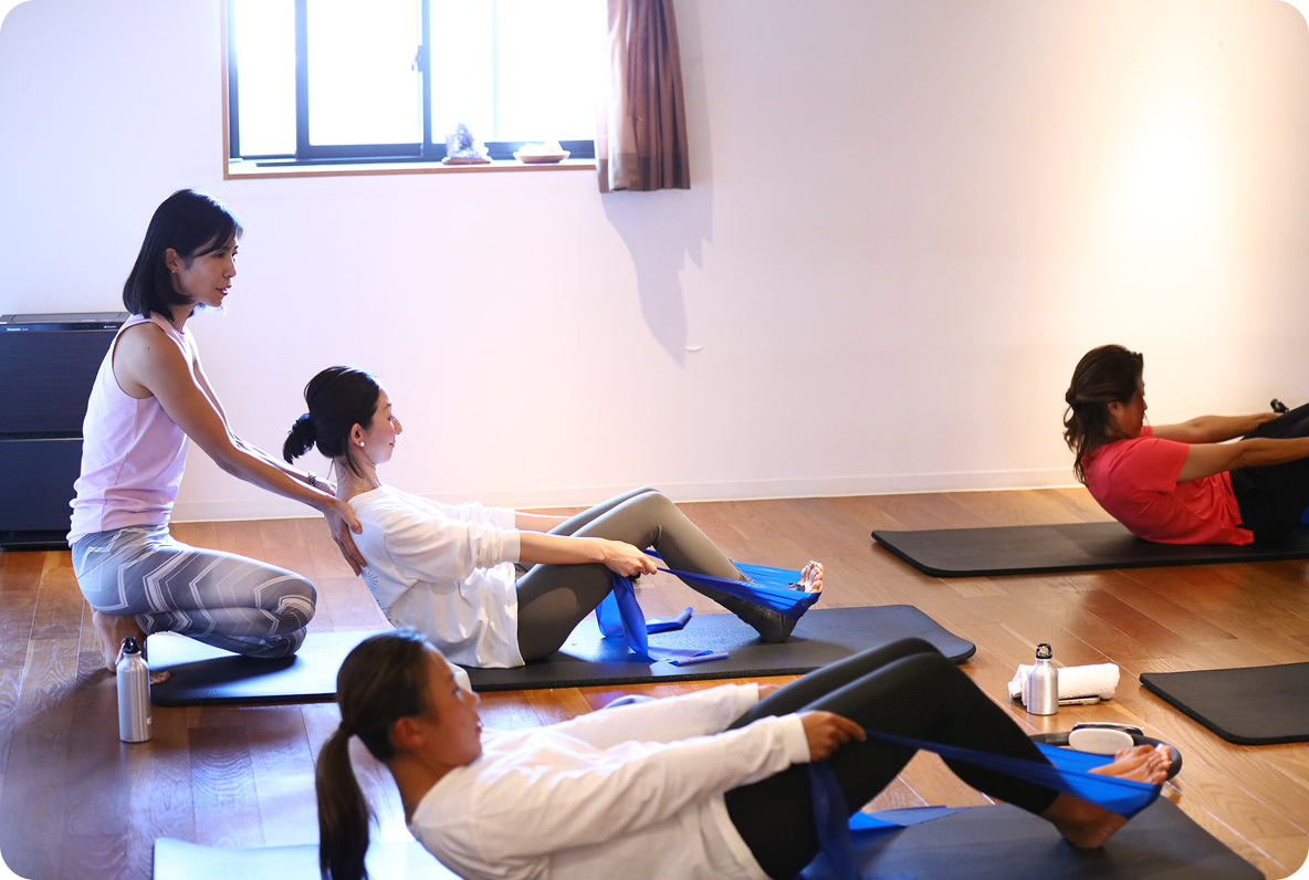 SUGATAのグループピラティスはマットを中心に行います。まずはマットの上で、呼吸や身体の使い方をじっくり学びましょう。ポール・ピラティスリング・ボールなどの 使いながら、自分自身で身体を整えていきます。